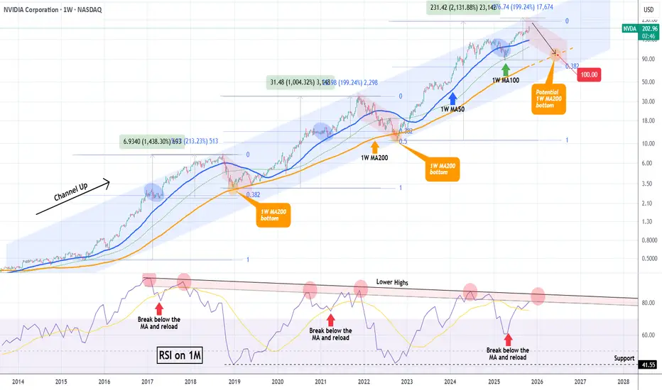We previously had NVIDIA's top at around $240, which is slightly below this expected +200% rise from the 1W MA100 bottom. As a result, we project that a potential contact with the 1W MA200 for the 2026 Bearish Leg can be achieved around $100, which is above the 0.382 Fib, similar to 2018.