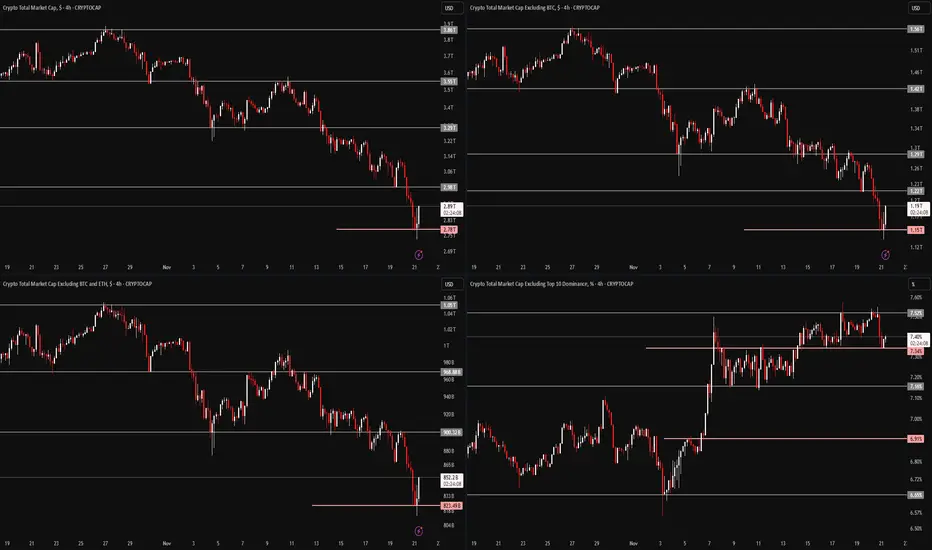 TOTAL3 previously hovered around $1.05T and has experienced a milder decline compared to TOTAL and TOTAL2. It is currently sitting at its major support near $832B, testing a multi-timeframe support zone.