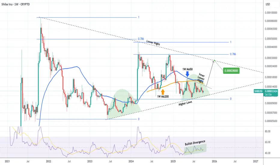 Shiba Inu (SHIBUSD) has been trading within a Triangle pattern since the October 25 2021 Top of its previous Bull Cycle. The successive Lower Highs of the current Cycle have failed to make a new All Time High (ATH) and have 'trapped' the price action below its 1W MA50 (blue trend-line), is a similar Accumulation Phase on the Higher Lows like June 2023 - January 2024.