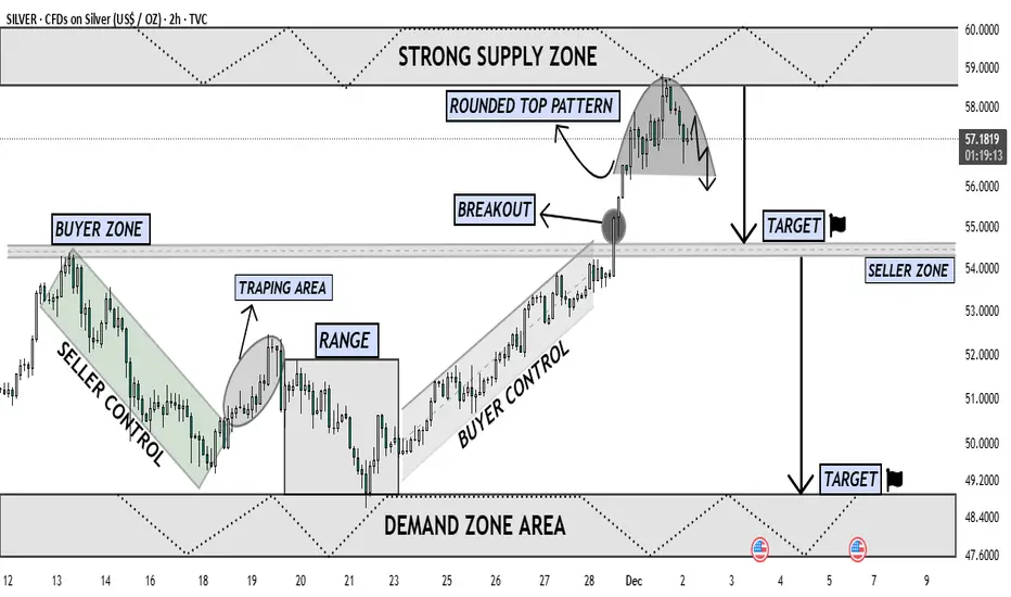 The chart shows Silver reaching a major Strong Supply Zone near the 58–60 level, where price has reacted multiple times in the past. After a strong impulsive rally driven by Buyer Control, the market broke above the previous Buyer Zone, confirming bullish strength. However, once price entered the upper supply region, momentum started to fade, forming a clear Rounded Top Pattern — a classic distribution structure indicating exhaustion of buyers.