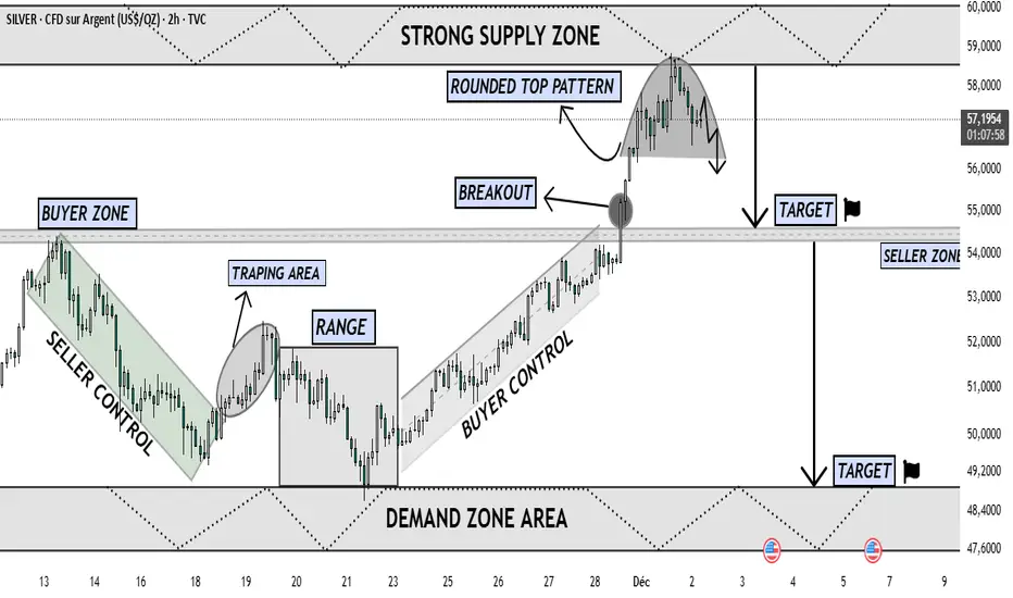 Le graphique montre que l’argent est entré dans une forte zone d’offre autour de 58–60, une zone où le prix a déjà réagi à plusieurs reprises par le passé. Après une phase haussière solide dominée par les acheteurs, le marché a réussi à casser la précédente zone d’achats, confirmant une dynamique positive.