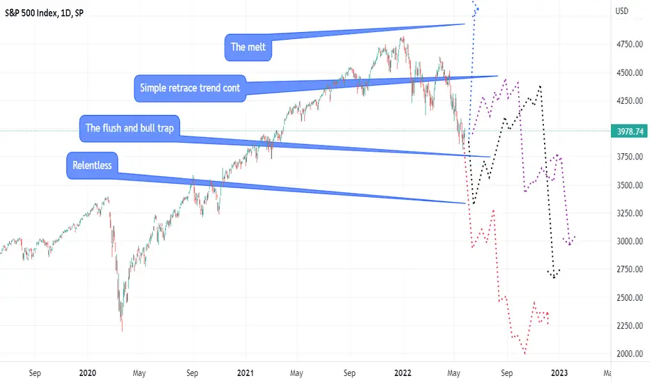 3 - The flush. What I am currently positioned for and think looks most likely. The market has grinded on down for a while. There's a lot of rallies but they've tended to push back to lows. A long period of consolidation on a level flagging up different types of bull signals. Despite these things we've clearly not broken the downtrend yet and our current action feels like a bigger version of the chop before the drop to 3820.