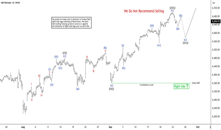 The short-term Elliott Wave analysis for the S&P 500 (SPX) indicates that the cycle starting from the August 2, 2025 low is unfolding as a five-wave structure. From that low, wave ((i)) concluded at 6481.34. The subsequent pullback in wave ((ii)) developed as a running flat Elliott Wave pattern. In this structure, wave (a) declined to 6343.86, wave (b) rallied to 6508.23, and wave (c) fell to 6360.3, completing wave ((ii)) at a higher degree.
