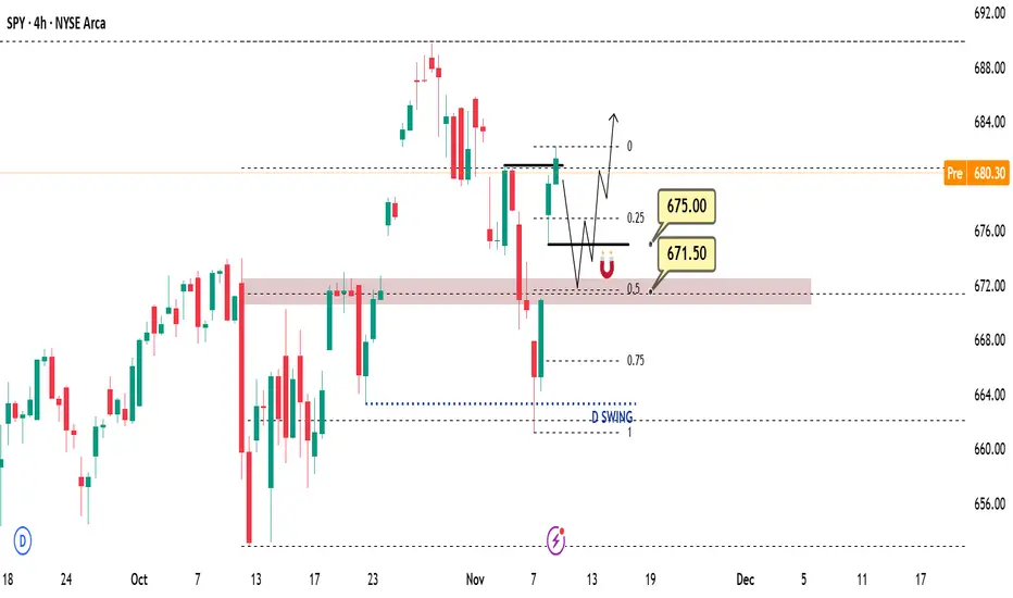 Price moved sharply higher on Monday, reaching the 681 level as expected (see my previous SPY outlook). The 681 level remains a strong resistance zone, and we have already seen a rejection from that area.