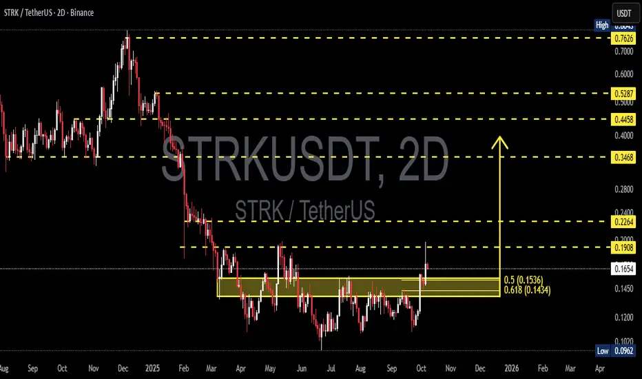 After months of sideways movement, STRK is finally showing signs of life. On the 2D timeframe, price action is shaping a classic breakout–retest structure, with a strong demand zone between 0.1434–0.1536, aligning perfectly with the Fibonacci golden pocket (0.5–0.618).