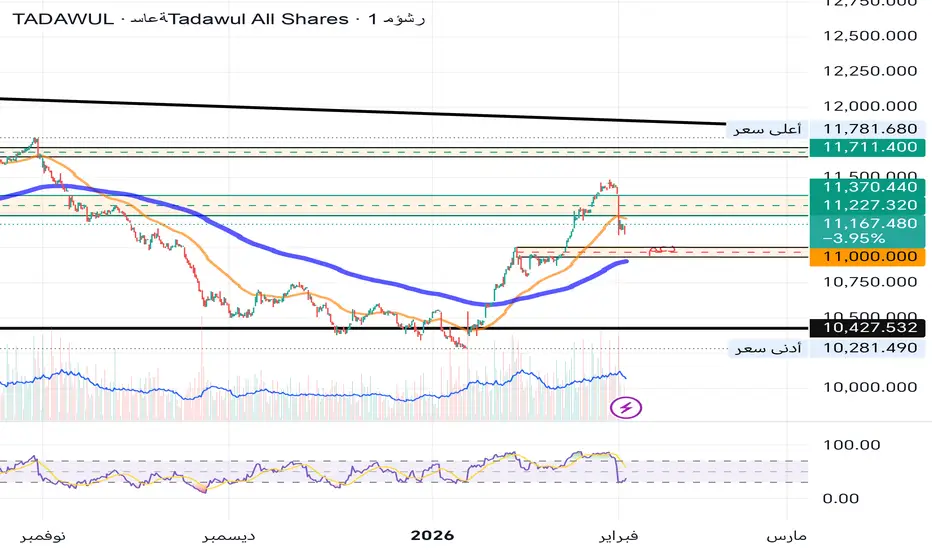 على فاصل الساعة فالمؤشر العام هبط بالأمس هبوطًا قويًا متأثرًا بالذهب، وقد كان من المتوقع أن يكون هذا الهبوط بشكل تدريجي من باب التصحيح المتوقع بعد الصعود إلى هذه المناطق، وقد نبهت في تحليل سابق إلى ظهور بعض المؤشرات الدالة على قرب التصحيح مثل الدايفرجنس السلبي على فاصل الساعة في المؤشر العام وفي بنك البلاد، والمتوقع الآن بحسب السلوك، فإن المؤشر العام سيتجه نحو منطقة الطلب الظاهرة على الرسم البياني، وآمل أن يكون الارتداد منها، وأما كسرها أحجام عالية فقد يدخل السوق في موجة سلبية جديدة!