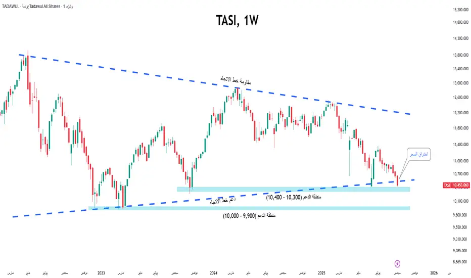 واصل مؤشر تداول (TASI) تراجعه الأسبوع الماضي، منخفضًا بنحو 2% ليغلق عند مستوى 10,450 نقطة. وتشير حركة السعر إلى بداية مرحلة هبوط جديدة، مع احتمالية استمرار الهبوط على المدى القريب.