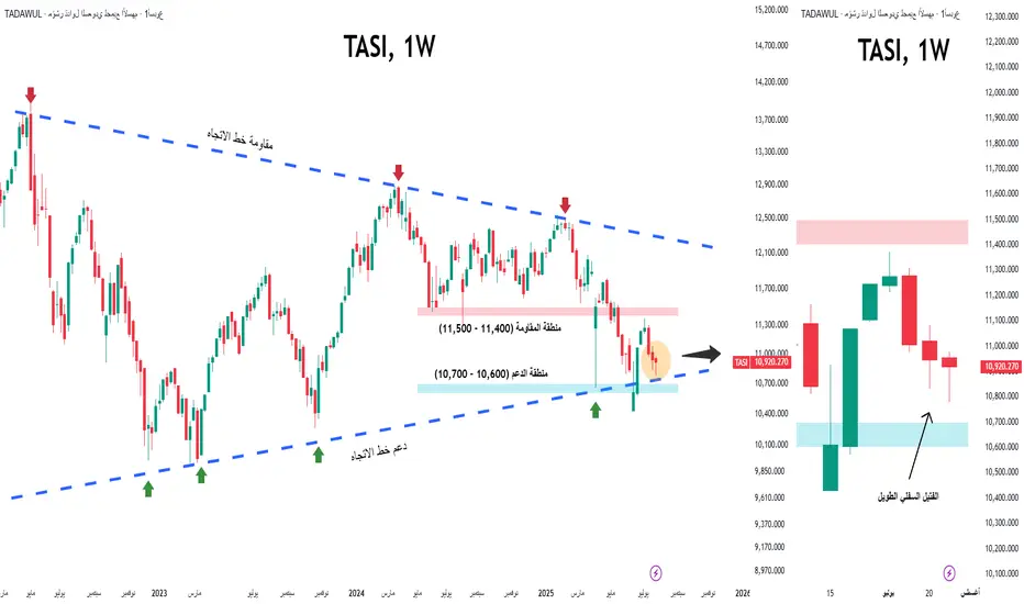 يبدو أن مؤشر تداول (TASI) يتلقى دعمًا حاسمًا عند خط اتجاه طويل الأجل على الرسم البياني الأسبوعي. على مدار الأسبوعين الماضيين، عكست حركة السعر إقبالًا ملحوظًا على الشراء من مستويات أدنى، كما يتضح من تشكّل فتائل سفلية طويلة على الشموع الأسبوعية.