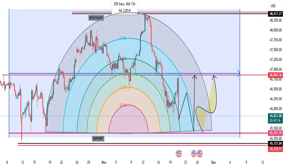 🌀 US30 Technical Outlook — Fib Arc Compression Near Support 🟩📉📈