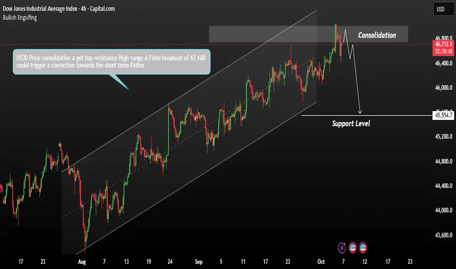 The US30 has recently shown strong consolidation near its top resistance zone, forming a new record high around 47,100. However, the breakout above this level appears to be losing momentum, raising the possibility of a false breakout.