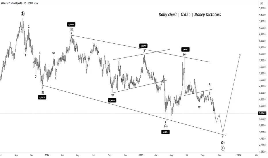 USOIL is forming a clear corrective pattern inside a falling channel. Price is currently in the final leg of wave (5) of (C), suggesting one more dip is likely before reversal.