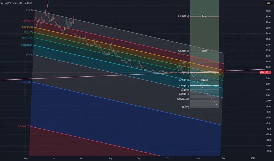 I cooked up a way to find entries and exits on UVIX in the event of another volatility event, adjusted for decay. Let me know how I could improve the chart, I'm new to drawing diagonal fibs but thought I'd give it a shot.