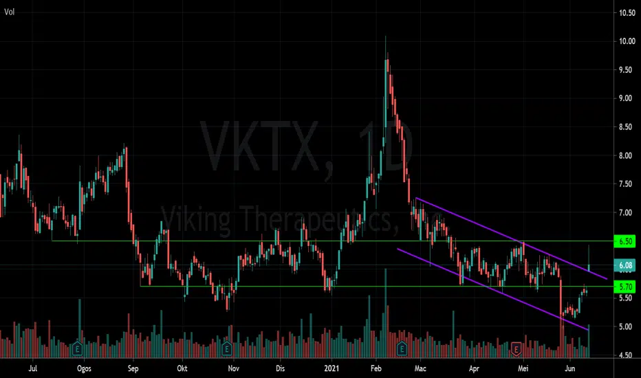 VKTX telah pecah saluran menurun dengan gap dan volume tinggi.