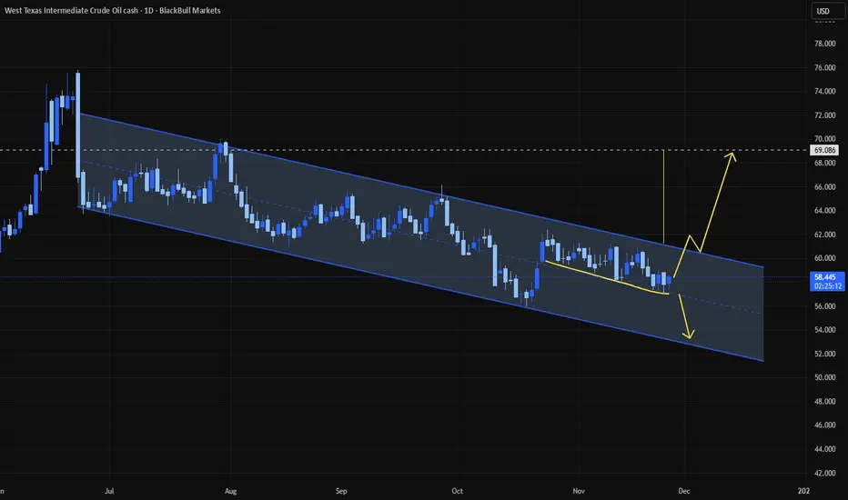 For over a month, oil has been hovering right around the channel’s midline, leaving the market indecisive. We have two scenarios for this situation. Since this analysis is on the daily timeframe, it could take several weeks for either scenario to play out—or it could happen overnight.