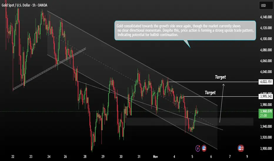 Gold consolidated towards the growth side once again, though the market currently shows no clear directional momentum. Despite this, price action is forming a strong upside trade pattern, indicating potential for bullish continuation.