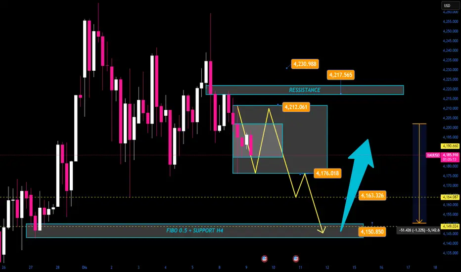 H4 sedang bergerak mendatar dengan jelas: badan lilin kecil – bayang atas bawah panjang, menunjukkan keraguan sebelum FOMC (berlaku malam 11 hingga pagi 12).