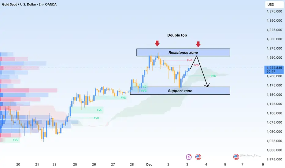 From a technical perspective, the 4,180–4,190 FVG zone helped lift price again after the sharp drop, but gold remains capped beneath the upper FVG resistance. The Ichimoku cloud on the 2H timeframe shows price approaching the Kijun–Senkou intersection — an area that historically attracts selling pressure. This keeps the current price action more aligned with a supply retest rather than the beginning of a genuine bullish trend.