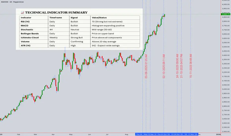 RSI (Daily): Currently at 68, approaching overbought territory but not yet extreme. Historical analysis shows gold can sustain RSI above 70 for extended periods during strong trends.