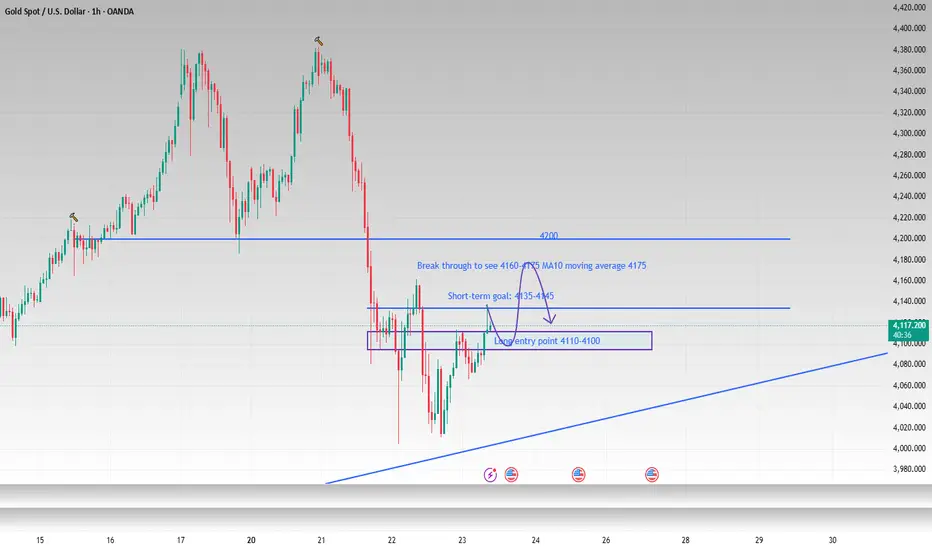 The gold price rebounded to around 4135 during the day and then fell back. As I told you yesterday, this position is a relatively dense trading area. I believe the current decline is the market accumulating strength to hit yesterday's rebound high, and it also provides us with a good opportunity to enter the long market. Pay attention to 4110-4100 below. If it retreats to this range, you can try to go long on gold in batches. The first target can continue to look at 4135-4145.