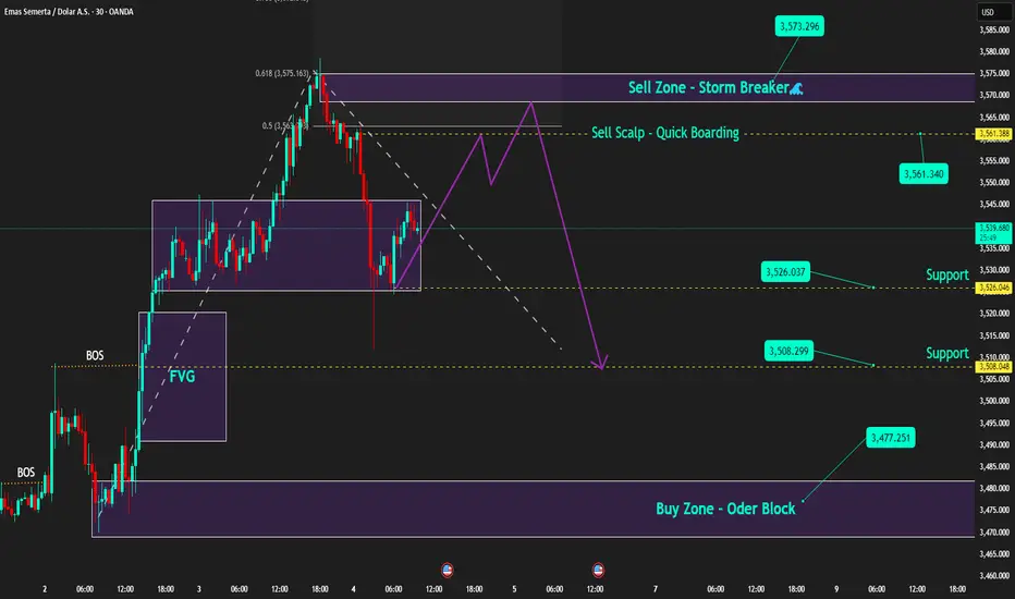 🌊 Storm Breaker (Sell Zone 3,573 – 3,575): sejajar dengan rintangan fibo 0.618–0.786, berpotensi wujud tekanan jual kuat.