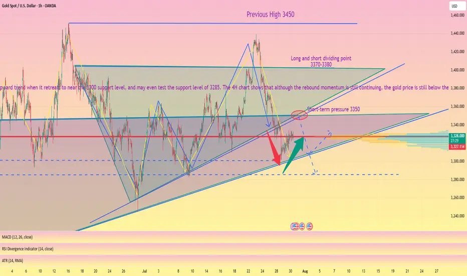 📉Judging from the daily chart, I have clearly stated in the figure before that the current trend is a converging triangle. If the price hits the triangle boundary, coupled with the interference of external news, it may trigger panic selling, killing a wave of long buyers first🐂, and then trigger an upward trend when it retreats to near the 3300 support level, and may even test the support level of 3285. 🩳