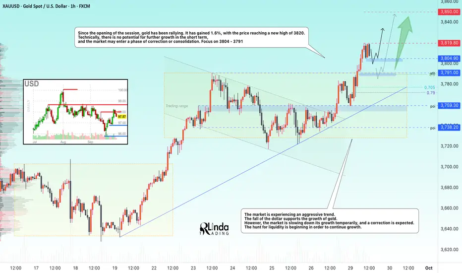 The market is experiencing an aggressive trend. The fall of the dollar supports the growth of gold. However, the price of the metal is slowing down temporarily, and a correction is expected. The hunt for liquidity is beginning in order to continue growth. Technically, the focus is on 3804 - 3791. A false breakdown of support could resume the bull run.