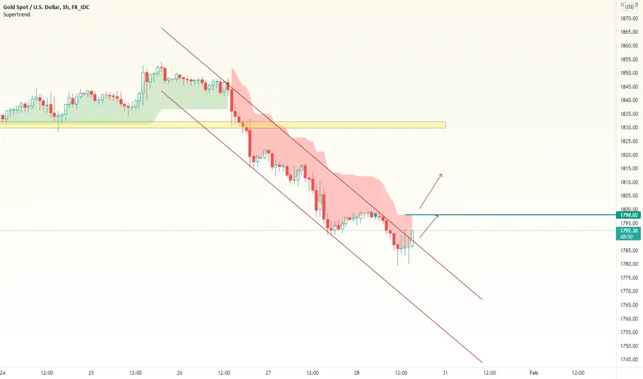 buy on break above channel pattern in 1hr or if supertrend turns green ... 1 hr setups are short term trades .. average pips gain 20-50 ..