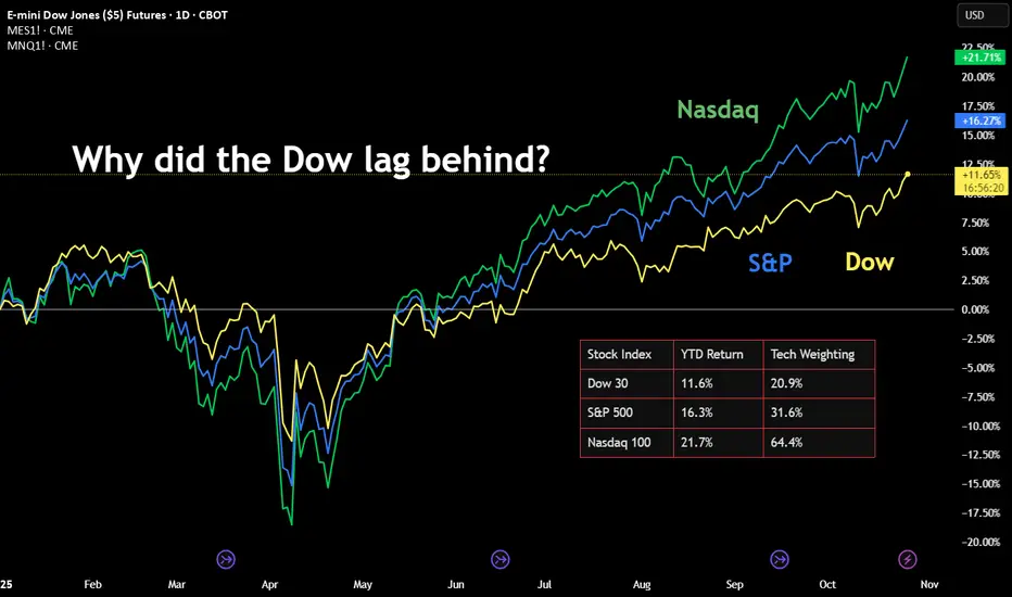 Why did the Dow lag behind the S&P and the Nasdaq? A simple answer is due to its lower index weight on technology. Since the current bull market is primarily driven by A.I., the Dow benefited less comparing to the other two stock indexes.
