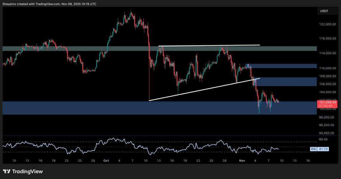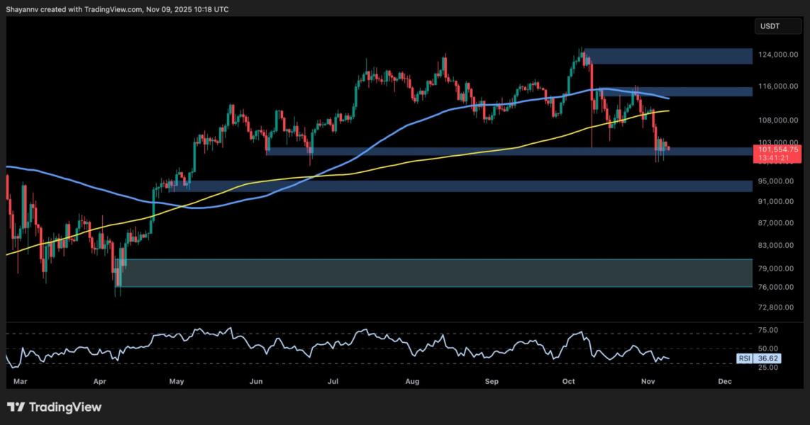 On the daily timeframe, BTC has broken below both the 100-day and 200-day moving averages, located around the $110K mark, indicating that short-term momentum has shifted bearish. The price is currently hovering around the key $100K level, which acted as support during recent corrections.