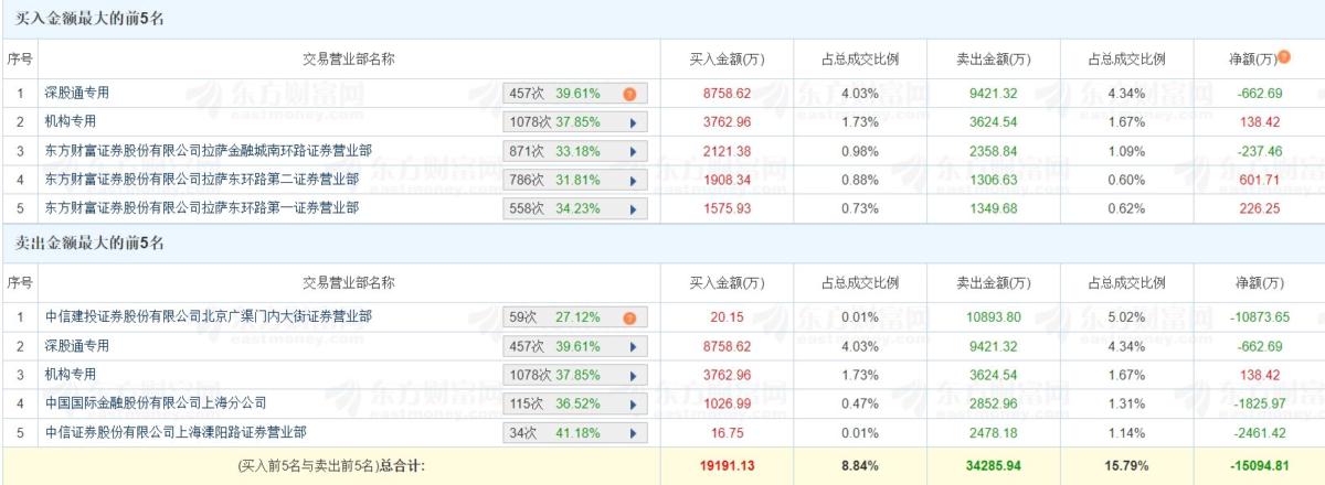 龙虎榜 | 中信海直大跌9.25% 呼家楼净卖出1.09亿元