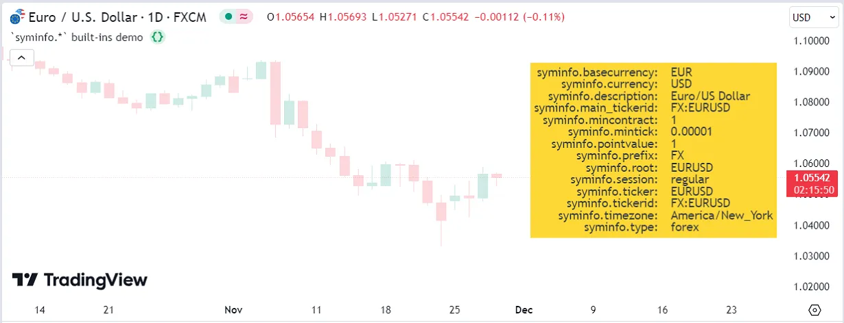 - syminfo.basecurrency: the base currency, e.g., “BTC” in “BTCUSD”, or “EUR” in “EURUSD”.