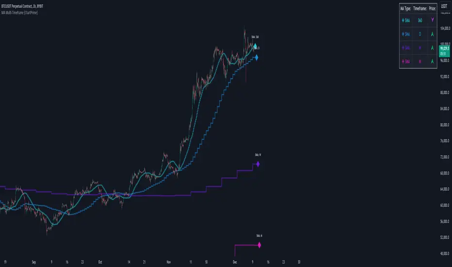The MA Multi-Timeframe [ChartPrime] indicator is a versatile and powerful tool for traders looking to monitor price trends across multiple timeframes with different types of moving averages. The dashboard simplifies trend identification, while the customizable options make it easy to adapt to individual trading strategies. Whether you're analyzing short-term price movements or long-term trends, this indicator offers a comprehensive solution for tracking market direction.