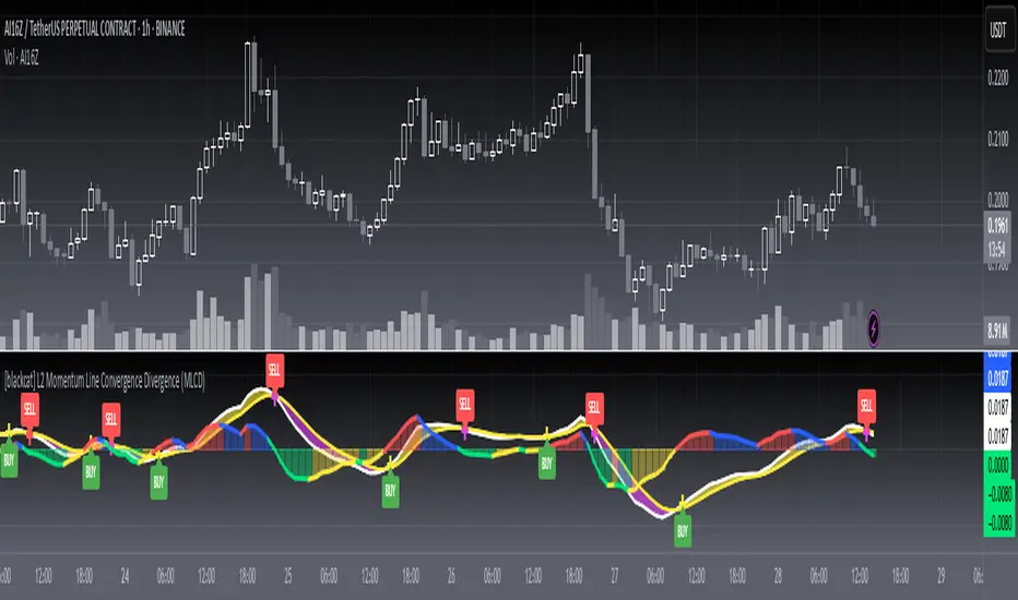 OVERVIEWThe [blackcat] L2 Momentum Line Convergence Divergence (MLCD) indicator provides traders with a comprehensive view of market momentum through convergence and divergence signals, aiding in identifying potential buying and selling opportunities.