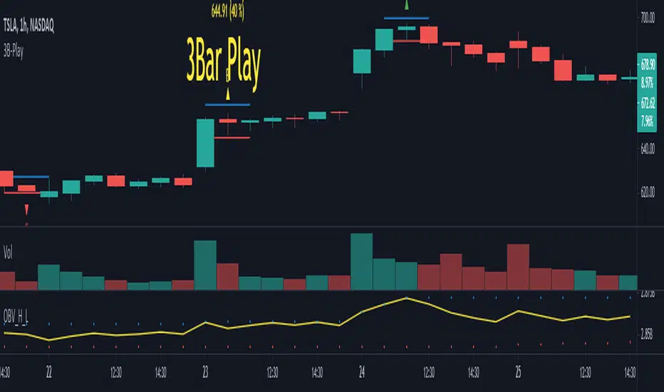 This script aims to mark 3 Bar play patterns (both short and long) by identifying them on the chart, with an arrow pointing up from long and down for short. Aswell, setting alerts based on grade.