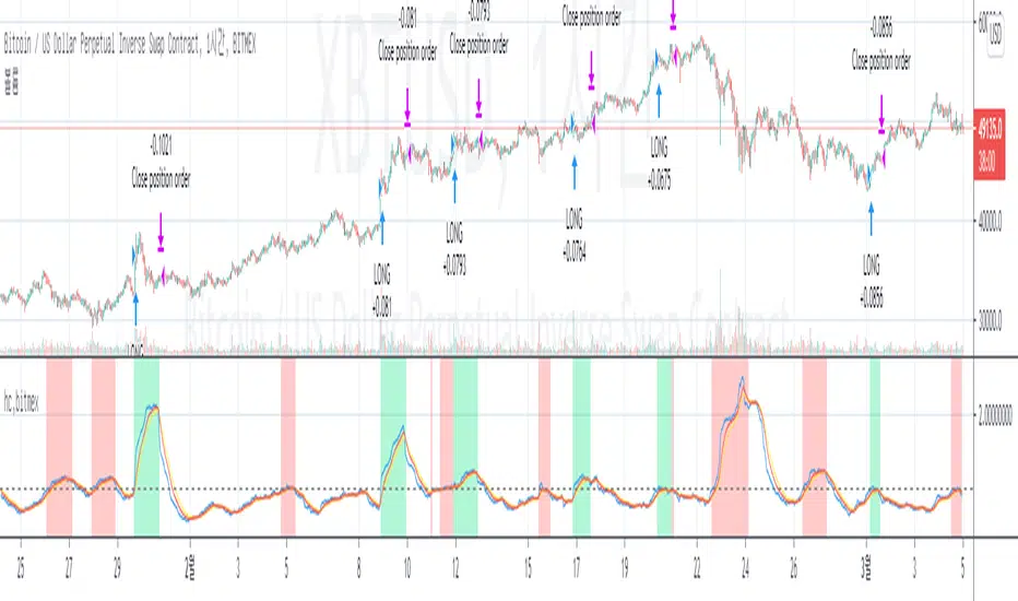 What is going on here? This strategy is pretty simple. We start by measuring a very long chunk of volume history on BitMEX:XBTUSD 1 hour chart to find out if the current volume is high or low. At 1.0 the indicator is showing we are at 100% of normal historical volume . The blue line is a measure of recent volume! This indicator gets interested when the volume drops below 90% of the regular volume (0.9), and then comes back up over 90%. There's usually a pump of increased price activity during this time. When the 0.9 line is crossed by the blue line, the indicator surveys the last 2 bars of price action to figure out which way we're going, long or short. Green is long. Red is short. To exit the trade we use a 7 period fast ema of the volume crossing under an 11 ema slower period which shows declining interest in the market signifying an end to the pump or dump. The profit factor is quite high with 5x leverage, but historically we see 50% drawdown -- very risky. 1x leverage looks nice and tight with very low drawdown. Play with the inputs to see what matches your own risk profile. I would not recommend taking this into much lower timeframes as trading fees are not included in the profit calculations. Please don't get burned trading on stupid high leverage. This indicator is probably not going to work well on alts, as Bitcoin FOMO build up and behavior is different. This whole indicator is tuned to Bitcoin , and attempts to trade only the meatiest part of the market moves.