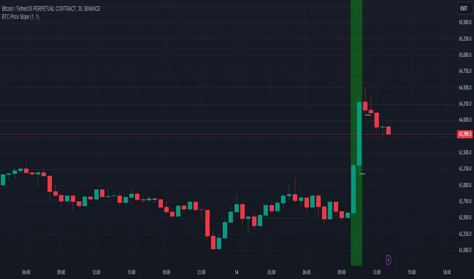The indicator calculates the price slope of Bitcoin over a user-defined period. It monitors the slope and triggers alerts when the slope crosses predefined thresholds, indicating potential trend changes. The indicator also provides visual cues on the chart, such as background colors and lines, to help users easily spot these trends.