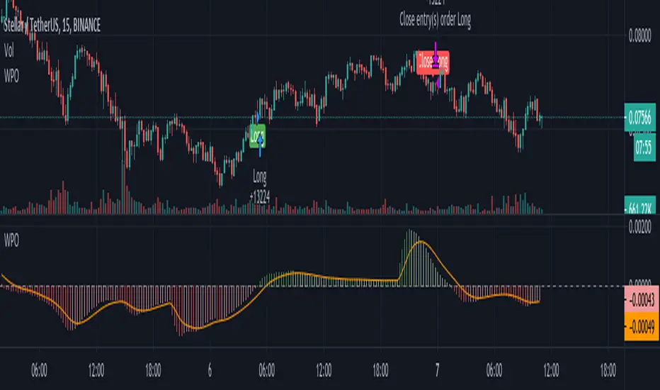 Weighted Price Oscillator is an unique indicator that shows the relationship between two custom variables that trigger signals upon specific conditions. When WPO (short for weighted price oscillator ) crosses over the signal or zero line, it creates a buy signal and conversely below the signal or zero line, it generates a take profit signal. All of which are provided that the specific conditions are met.