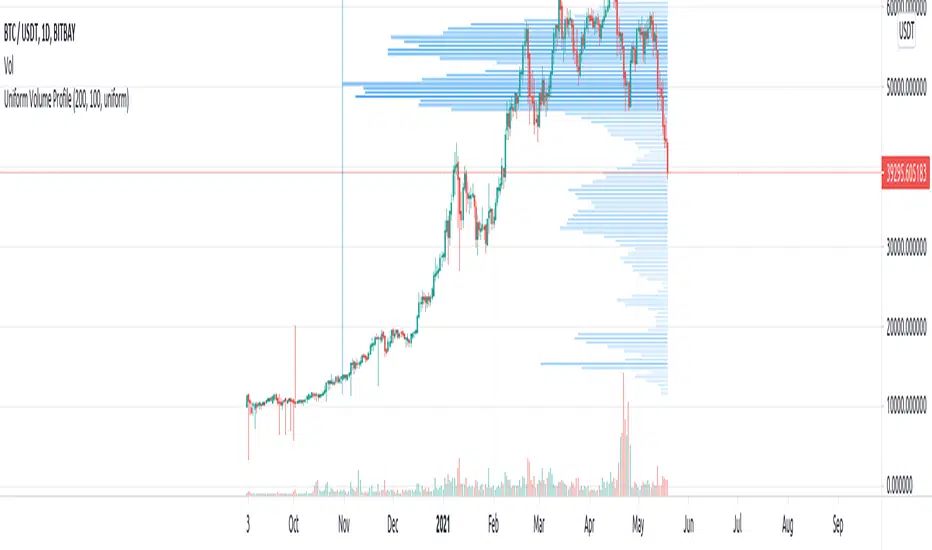 The volume of a single candlestick is uniformly distributed by its range (high - low) along all the colliding volume profile bars.