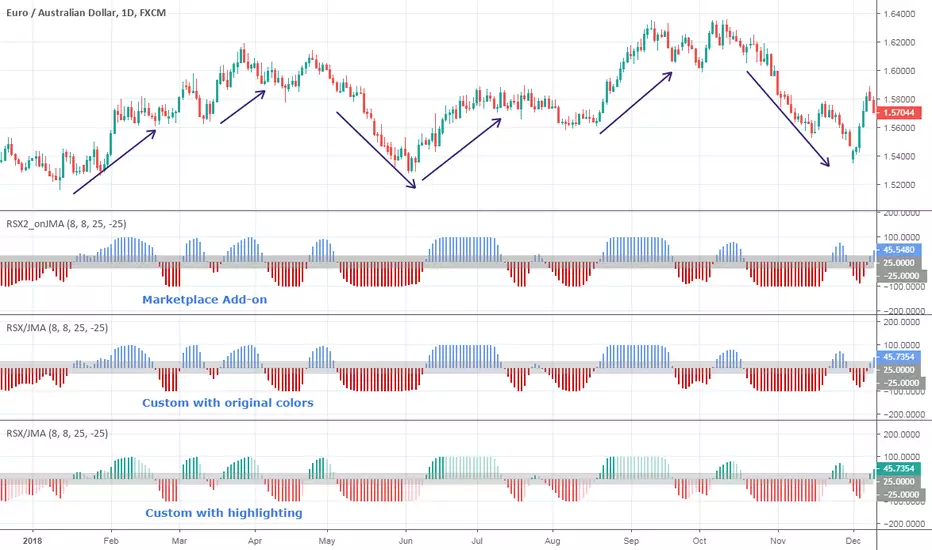 "A smooth (low noise) trend is more efficient than a noisy trend. Given that RSX measures market trend direction and efficiency, it stands to reason that RSX would respond better (display larger dynamic range) when fed pre-smoothed price data. And there's no better way to pre-smooth than by using JMA".