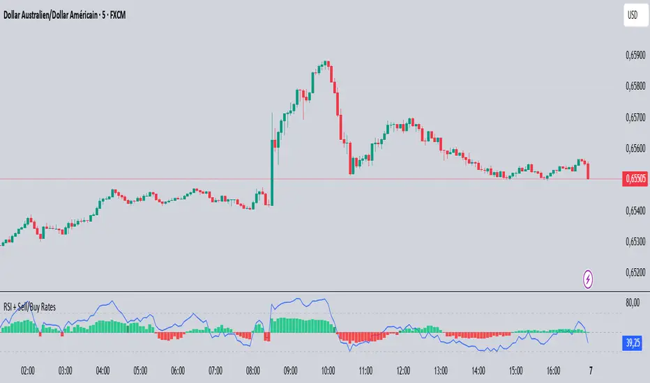 Sell/Buy Rates = des barres vert/rouge qui mesurent la pression acheteurs vs vendeurs (calculé à partir des bougies et du volume), centrées sur 50. > 50 (vert) : acheteurs dominent. < 50 (rouge) : vendeurs dominent. Plus loin de 50 ⇒ plus fort. Avec le RSI : on ne fait que confirmer — RSI > 50 et barres > 50 → acheteurs ; RSI < 50 et barres < 50 → vendeurs ; sinon on s’abstient.