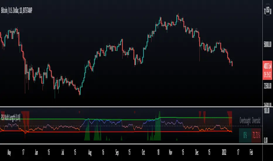 The following indicator aims to return information over RSIs using multiple periods, including the percentage of RSIs of different periods being overbought/oversold, as well as the average between these multiple RSIs.
