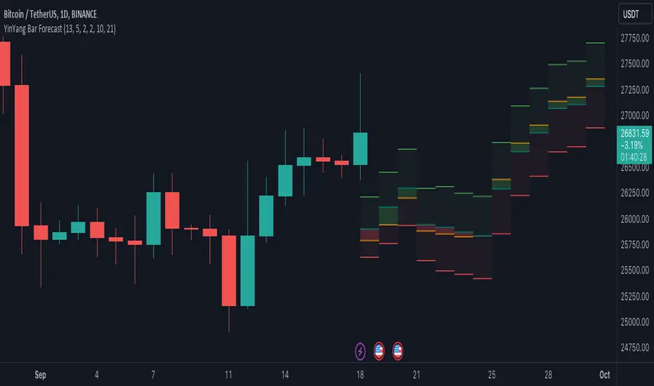 YinYang Bar Forecast is a prediction indicator. It predicts the movement for High, Low, Open and Close for up to 13 bars into the future. We created this Indicator as we felt the TradingView community could benefit from a bar forecast as there wasn’t any currently available.