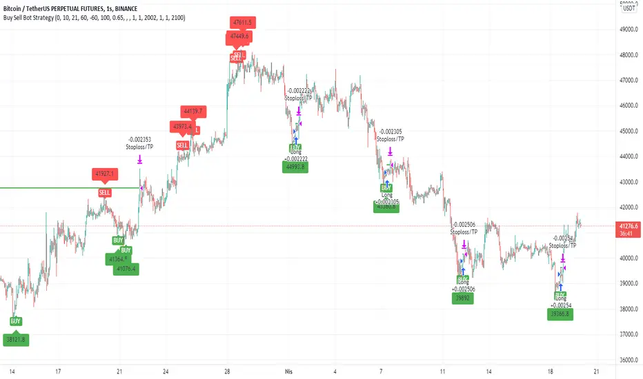 As you all know, we can send signals to bot sites via tradingview. You can use bot signals boxes in this strategy. You can analyze past transactions in the Date settings section. In the indicator settings section, you can change the settings of the overbought and oversold zones. Perhaps the most important feature here is the USE SELL SIGNALS section. I would like to emphasize this section in particular that when you mark the use sell signal section, the strategy will be processed in the buy section and will not be processed in the sell section. If you do not click on the USE SELL SIGNALS section, the strategy will be processed in the buy section, but this time it will be exited when the target in the take profit section is reached. THIS WAS IMPORTANT.