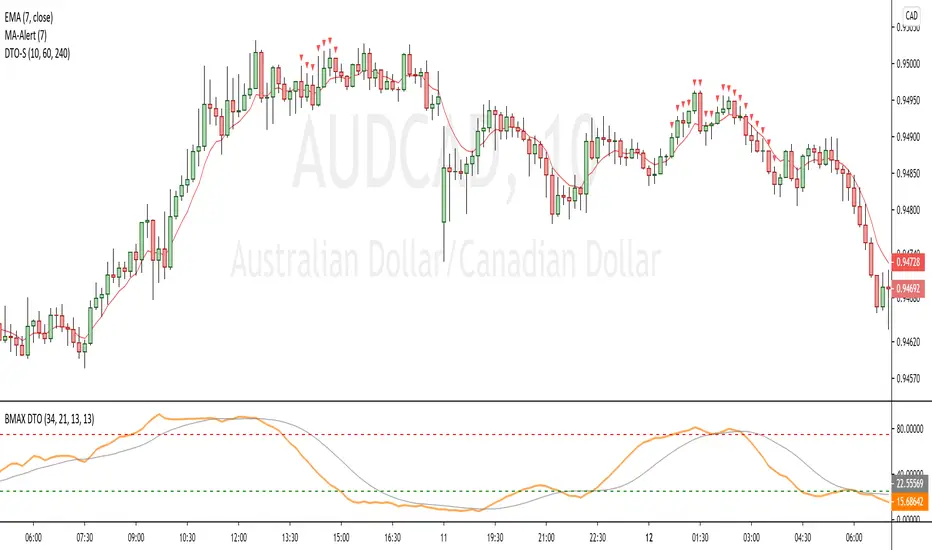 Este indicador é uma variação do indicador DT Oscillator original que utiliza Estocástico e cálculos do RSI para encontrar oportunidades em "momentum". A proposta é facilitar o monitoramento de múltiplos tempos gráficos para condições de sobrecompra ou sobrevenda. Como você pode ver no example, com o uso do DT Oscillator no tempo gráfico escolhido, para que decidamos se tomamos uma posição no mercado, gostaríamos de verificar em múltiplos tempos gráficos uma condição fractal que construa um cenário provavel. DTO Signal indica quando 3 tempos gráficos escolhidos na configuração estão em uma mesma condição, de sobrecompra (acima de 75) ou de sobrevenda (abaixo de 25).