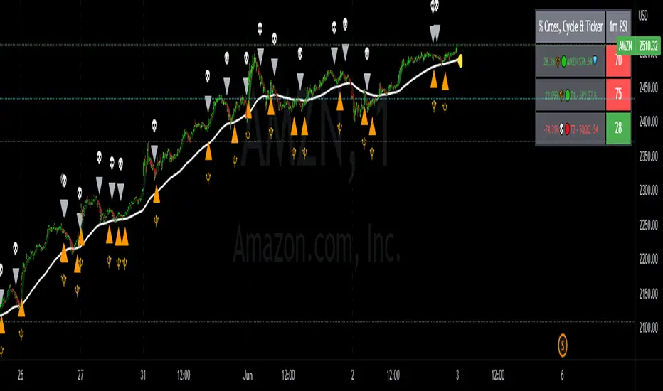 V10: In this update, the RSI table is greatly adjusted and fine tuned to display cycle and current crossing of two other tickers. On top of this, it weigh which of the 3 tickers has an absolutely strong crossing (it doesn't matter if it is in the negative direction and the other two are in the positive direction!)Further more, the optional (extra) ema lines were reduced from 4 to 1, primarily to improve performance of the indicator and to increase usability.