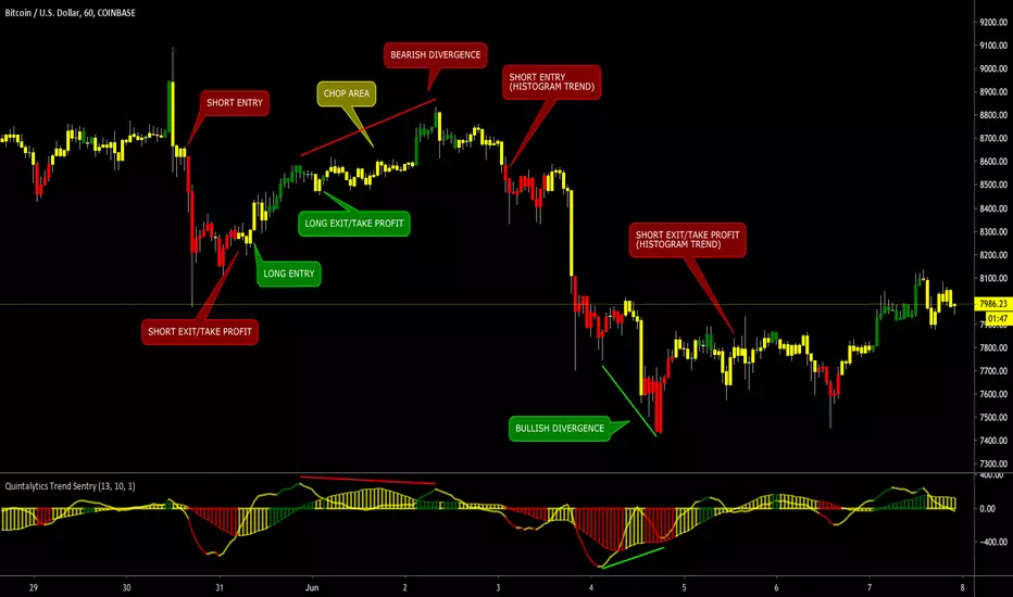 Quintalytics Trend Sentry is a combination of a Trend direction, Momentum, Sideways/Chop Detection, Trade position setup and Trade position exit indicator. This indicator is suitable for use in all timeframes, chart types (Bar, Renko, Range, etc.) and markets.
