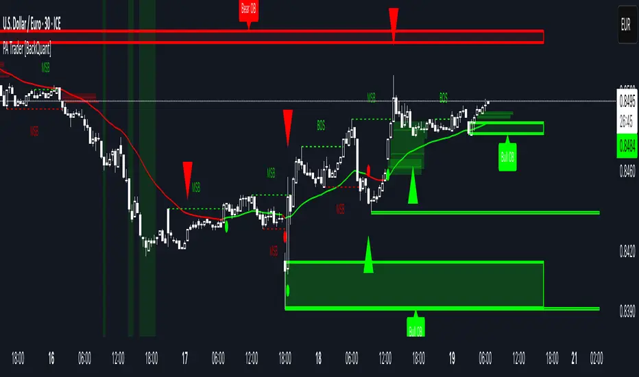 Price Action Trader is an all-in-one, chart-side workflow for reading trend, timing impulses, and mapping high-probability zones the way discretionary traders actually trade. It blends an ensemble trend engine with clean price-action building blocks—Market Structure (BOS/MSB), Fair Value Gaps, Order Blocks, and Volumetric Support/Resistance—so you can form a bias, find confluence, and execute with context.