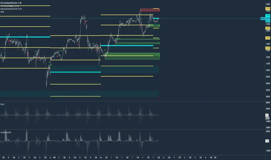 This indicator displays weekly standard deviation bands for US index futures (NQ1!, ES1!, MNQ1!, MES1!) using a professional approach: