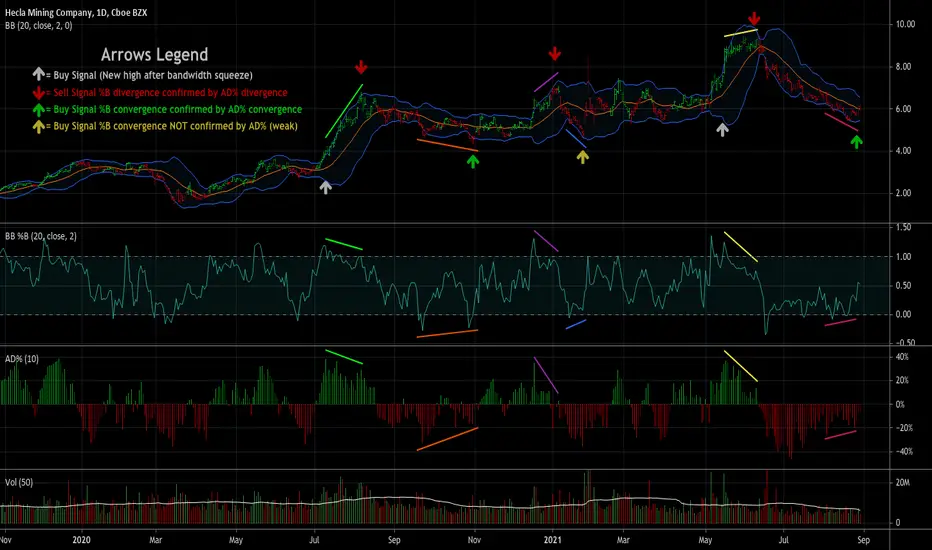 Securities behave differently from one another and this strategy doesn't work for all of them. As with any strategy, check past performance to make sure this approach is a good fit. Bandwidth ( volatility ) squeeze is another strategy which seems to work well for this security. For that reason, it was used to demonstrate buy signals, but squeezes aren't always so predictable. AD% may be useful for determining which direction a squeeze will resolve itself, as was the case here. Further information on volatility squeeze trading can be found in the John Bollinger book Bollinger on Bollinger Bands or online.
