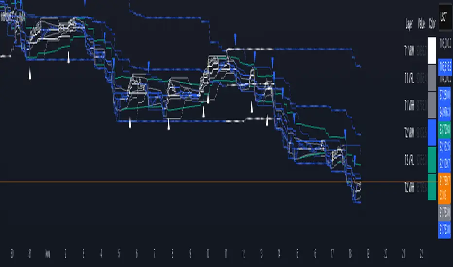 On the higher timeframe (T2), the same logic is applied, but the result is mapped back onto your chart. This gives you a slow, structural volatility regime behind your local candles. T2’s VRM is shown as a higher-timeframe trend line, with VRL and VRH acting as outer bounds that price will often respect even if they sit far away from current bars.